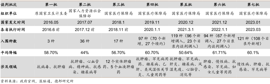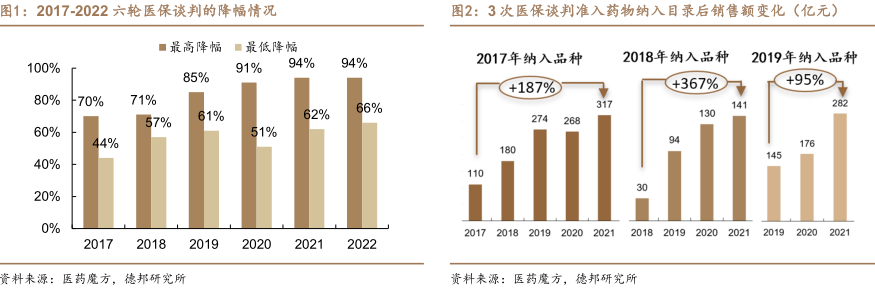 以价换量,进入医保有助于快速放量。医保目录的纳入给创新药提供了销售额的增量,整体上对创新药发展起到积极推动作用。从六次医保谈判看,降价幅度较为稳定,整体趋于合理,药物在进入医保后,基本都实现了迅速放量。