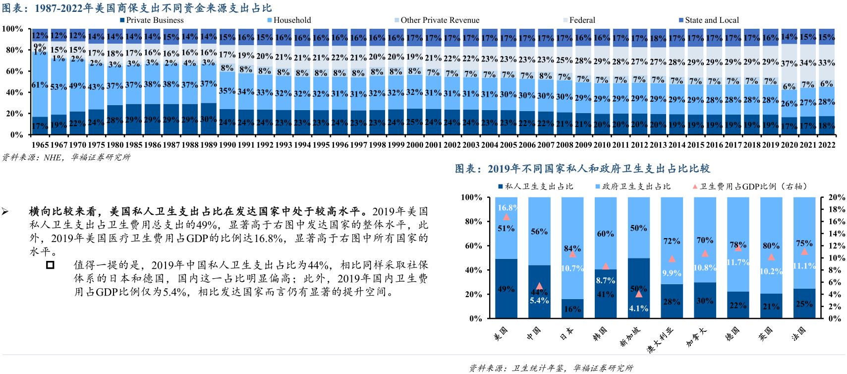 美国医疗支出的资金来源可分为私人(Private)和政府(Government)两大类,其中私人包括企业(Private Business)、个人(Household)和其他私人收入,政府包括联邦政府(Federal)和州政府(State and Local),从占比来看,(1)政府的支出占比自1965年以来快速提升,2022年支出占比已达48%,其中联邦政府支出占比持续提升,从1965年的9%提升至2022年的33%,成为美国医疗支出的最大单一资金来源方,而州政府支出占比较为平稳,2022年占比为15%;(2)私人支出占比自1965年以来持续下降,2022年支出占比已降至52%,其中个人支出占比快速下降,从1965年的61%降至2022年的28%,而企业支出占比较为平稳,2022年占比为18%。