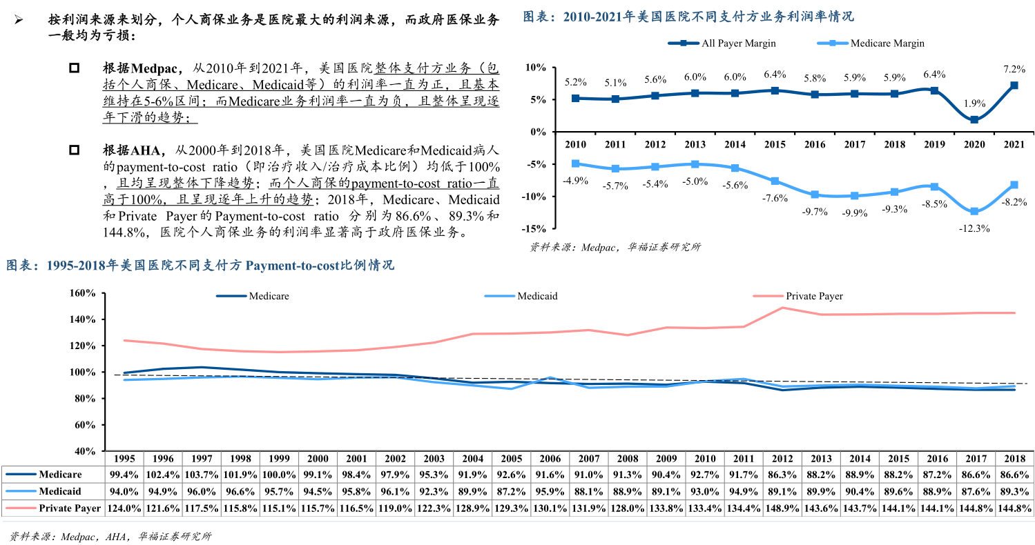 个人商保业务为美国医院最大利润来源,而政府医保业务利润率为负。