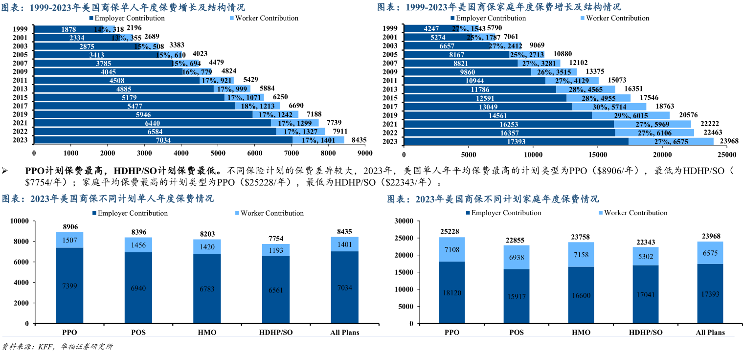 从1999-2023年,美国商业健康险保费呈现逐年上升趋势,企业和个人占比结构较为稳定。2023年美国单人年平均保费为$8435/年(1999-2023CAGR=5.77%),其中企业承担83%,个人承担17%;家庭平均保费为$23968/年(1999-2023CAGR=6.10%),其中企业承担73%,个人承担27%。