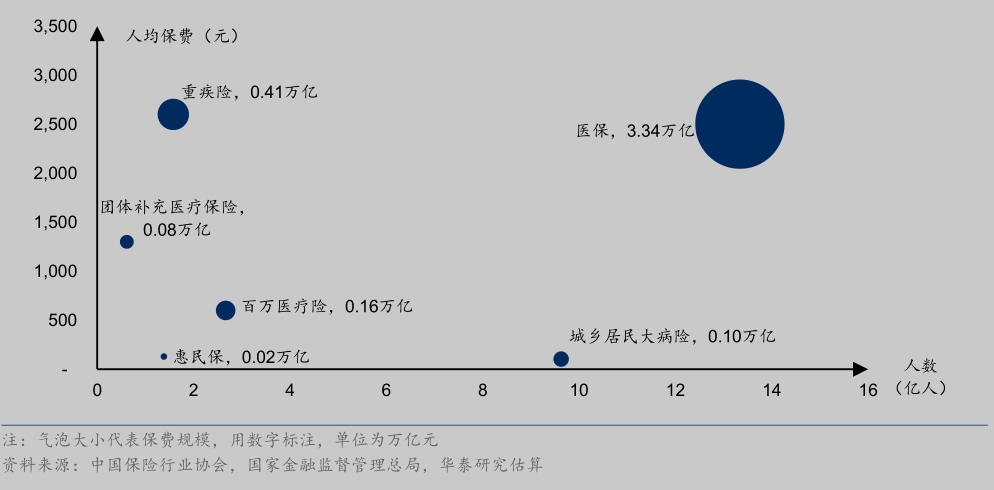 基本医保和各类医疗险构成了我国的医疗保障体系,其中医保扮演了最重要的角色。医保基金 2023 年收入 3.35 万亿,覆盖 13.3 亿人,人均 2511 元。无论从覆盖人群、总体规模还是人均资源,都远超商业保险。