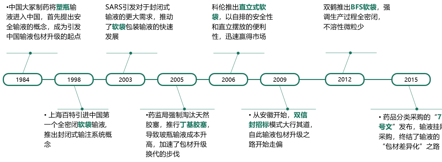 1984年到2006年的包材升级是基于临床需求,2009年到2015年包材差异化是基于双信封招标规则下的单独分组需求,2015年后新规则终结了输液包材差异化之路。