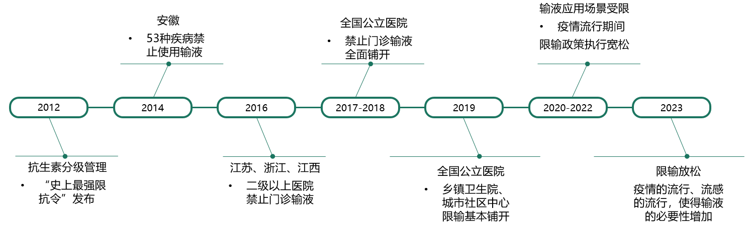 限抗限输政策从2012年开始逐步加码,到2019年达到顶峰,疫情期间输液应用场景受限,但限输政策执行力度减小,2023年执行力度仍宽松,2024年开始重新收紧