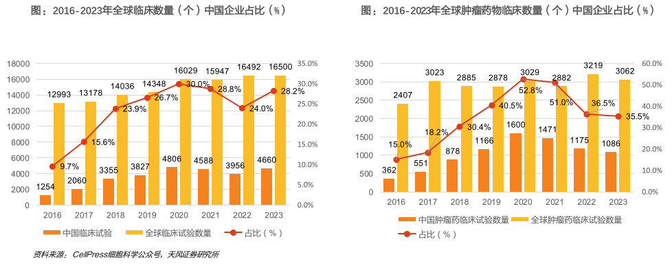 2024年发表在CELL上的《Challenges and opportunities in oncology drug development and clinical research in China》公布了2016-2023年全球范围内的临床数量及中国企业的占比。从全部适应症看,中国企业临床占比从2016年的9.7%增长至2023年的28.2%;从肿瘤药看,中国企业临床占比从2016年的15.0%增长至2023年的35.5%。