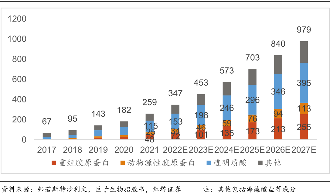2017-2021 年,中国医用敷料行业规模由67 亿元增长至 259 亿元,CAGR 高达 40.0%,预计 2027 年进一步增长至979 亿元,2022-2027 年 CAGR 为 23.1%。其中,基于透明质酸的医用敷料占比最高,2021 年渗透率为 44.4%,预计 2027 年仍为主流。基于重组胶原蛋白的医用敷料增长最快,2017-2021 年市场规模 CAGR 为 92.2%,2021年市场规模达 48 亿元,在整个医用敷料市场的渗透率为 18.5%,预计 2027年渗透率达 26.1%,市场规模为 255 亿元。