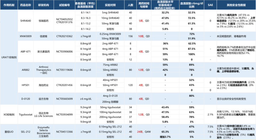数据来源:clinical trails,医药魔方,东吴证券研究所,注:血尿酸浓度单位换算 1 mg/dl=59.4 μm/L