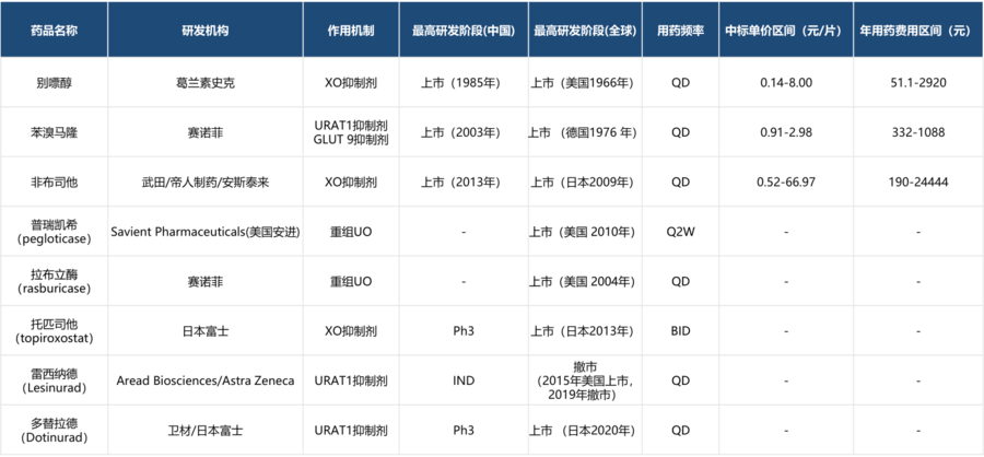 目前全球已上市的治疗高尿酸血症的药物
