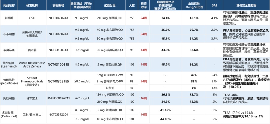 目前全球已上市的治疗高尿酸血症的药物临床数据
