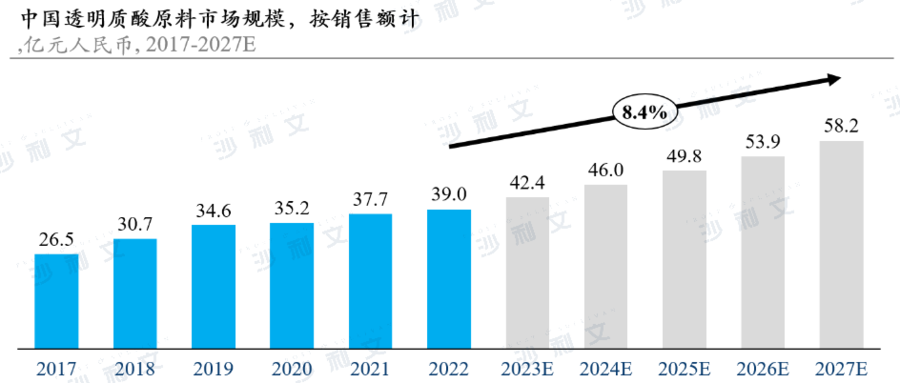 报告显示,由于中国2021年初释放的关于食品级透明质酸的政策红利,食品级透明质酸原料销量短期内快速增长。预计未来五年,中国透明质酸原料市场将保持8.4%的高复合增长率,在2027年达到58.2亿元人民币。