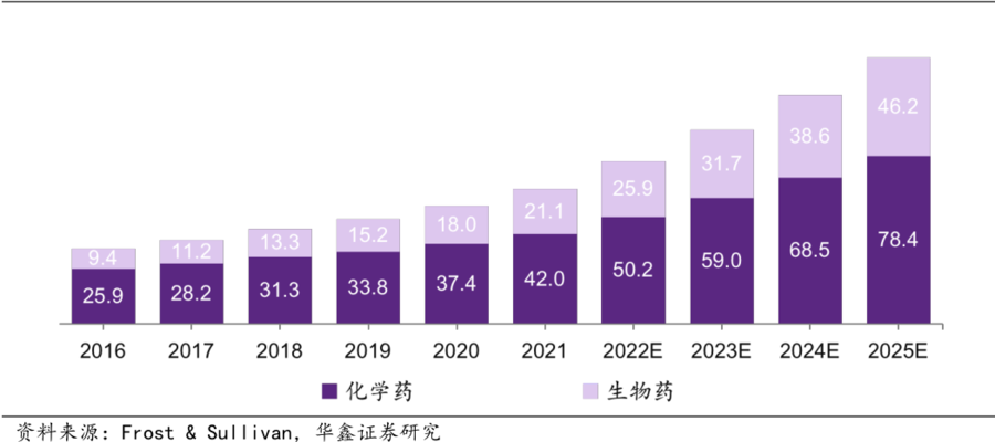制化原料药(CMO/CDMO)与新药研发和产业转移趋势相关,根据 Frost & Sullivan 的统计数据,2016 年到 2021 年,全球化学药 CDMO市场规模从 259 亿美元增加至 420 亿美元,年均复合增长率为 10.2%。根据 Frost &Sullivan 的预测,全球医药 CDMO 市场在 2022 年至 2025 年间将保持快速增长的势头,化学药 CDMO 市场规模将在 2025 年达到 784 亿美元。中国参与全球产业药的产业分工也在逐步提升,预计到 2025 年中国 CDMO 市场比重将提高至 19.6%。